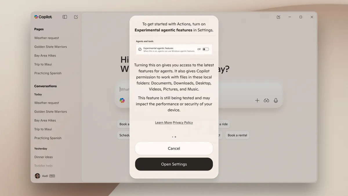 دستیار هوش مصنوعی جدید با نام "Copilot Actions" معرفی شده و بخشی از چارچوب جدید هوش مصنوعی عاملمحور است که به ویندوز ۱۱ اضافه میشود. این قابلیت بهصورت پیشفرض غیرفعال است، اما پس از فعالسازی، با اپلیکیشن Copilot یکپارچه میشود و به شما امکان میدهد با رایانه خود گفتگو کرده و از آن بخواهید کارهایی را برایتان انجام دهد.