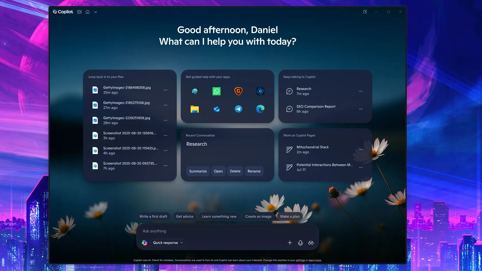 نسخهی 1.25082.132.0 و بالاتر حالا رابط کاربری شفافتری دارد که علاوهبر تغییرات ظاهری، چند ماژول کاربردی دارد؛ از جمله فایلهای اخیر، Copilot Pages، لانچر اپلیکیشنها و دسترسی به چتهای قبلی. پسزمینهی سادهی قبلی جای خود را به تصویری آرامشبخش با گل و آسمان آبی داده است.