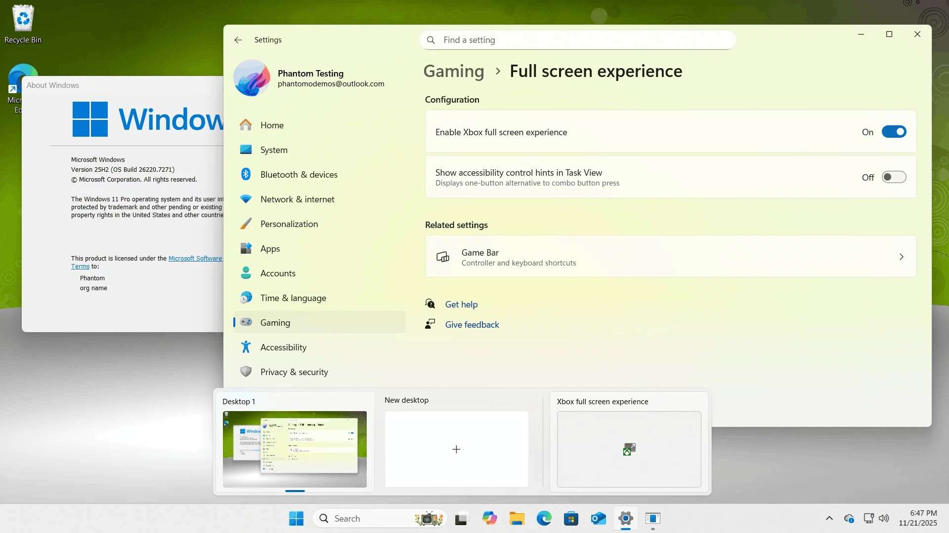 بیلد جدید ویندوز 11 با شماره 26220.7271 (کانالهای Dev و Beta اینسایدر) شامل قابلیت جدید Xbox Full Screen Experience است که میتوان آن را روی هر دستگاهی فعال کرد. پیشتر این حالت ویژه ویندوز فقط برای کنسولهای قابل حمل در دسترس بود، اما اکنون مایکروسافت آن را به رایانههای شخصی، لپتاپها و تبلتها نیز گسترش داده است.