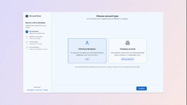 - ثبتنام رایگان: توسعهدهندگان فردی (علاقهمندان، دانشجویان و...) دیگر نیازی به پرداخت هزینه اولیه ندارند. کافی است با حساب شخصی مایکروسافت خود وارد شوید.