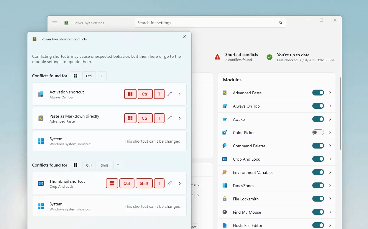 یکی دیگر از قابلیتهای مهم نسخه جدید، شناسایی تضاد میانبرهای صفحهکلید در میان ماژولهای PowerToys و عملکردهای سیستم ویندوز است. میانبرهایی که از قبل استفاده شدهاند با رنگ قرمز مشخص میشوند. یک بخش جدید در داشبورد اصلی تعداد کل تضادهای فعال را نمایش میدهد. با کلیک روی این بخش، جزئیات کامل قابل مشاهده بوده و امکان تغییر فوری میانبرها برای جلوگیری از تداخل فراهم است.