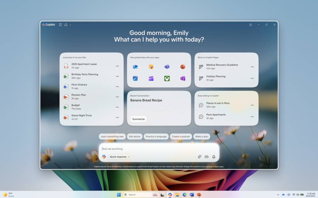 نسخهی 1.25082.132.0 و بالاتر حالا رابط کاربری شفافتری دارد که علاوهبر تغییرات ظاهری، چند ماژول کاربردی دارد؛ از جمله فایلهای اخیر، Copilot Pages، لانچر اپلیکیشنها و دسترسی به چتهای قبلی. پسزمینهی سادهی قبلی جای خود را به تصویری آرامشبخش با گل و آسمان آبی داده است.